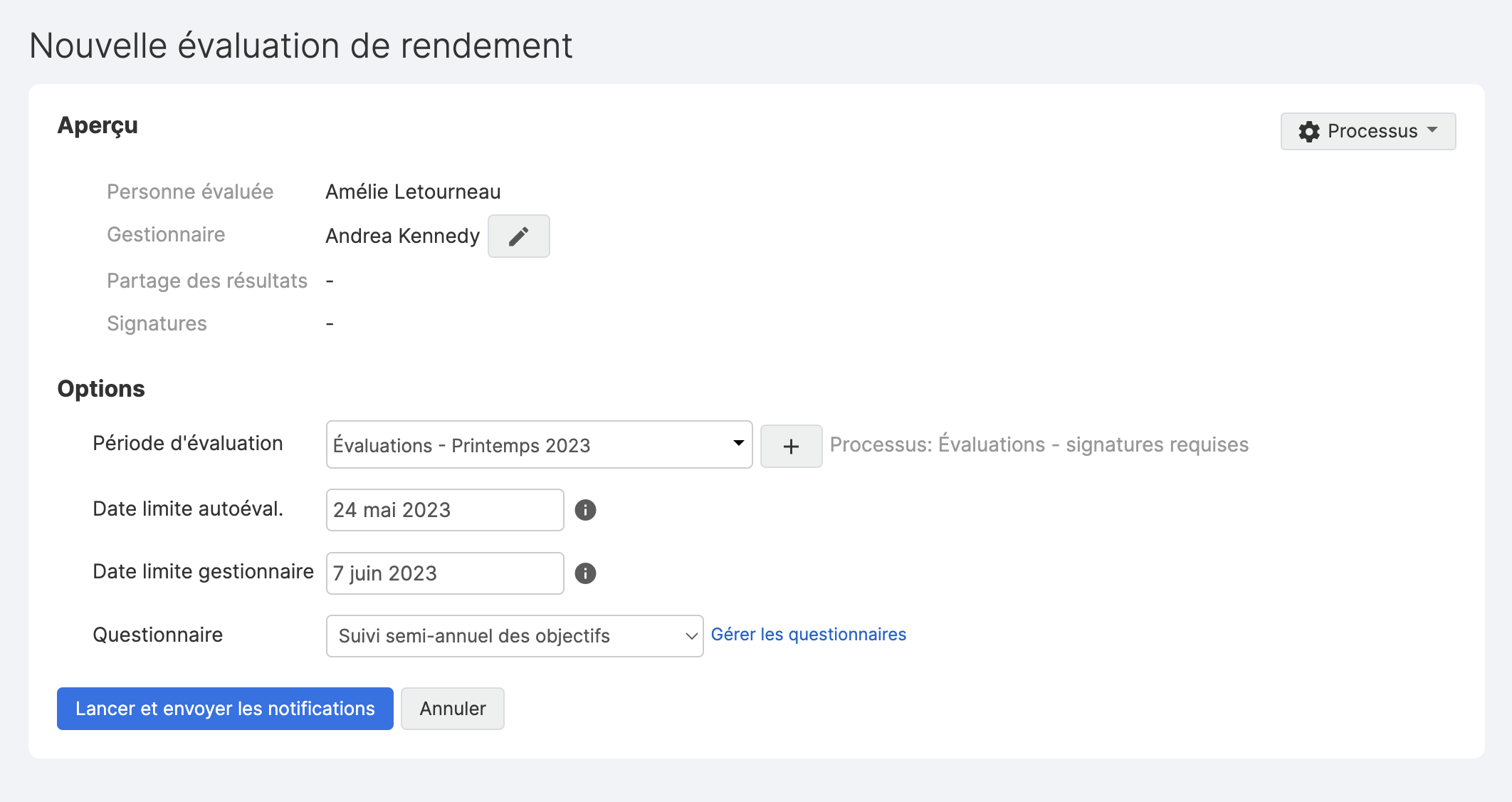 *Si vous souhaitez lancer plusieurs évaluations en même temps, consultez l'article Lancer une évaluation de rendement (pour plusieurs employés).