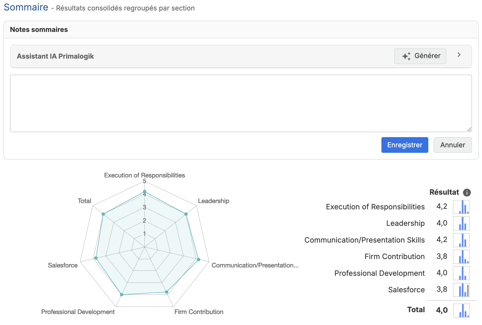 Oui. Le sommaire généré par l’IA est conçu comme un point de départ. Vous pouvez le copier dans la zone de texte Sommaire d’évaluation, puis le réviser pour qu’il corresponde au ton, au contexte de votre organisation et à ce que vous souhaitez inclure. Une fois satisfait, enregistrez pour conserver la version finale.