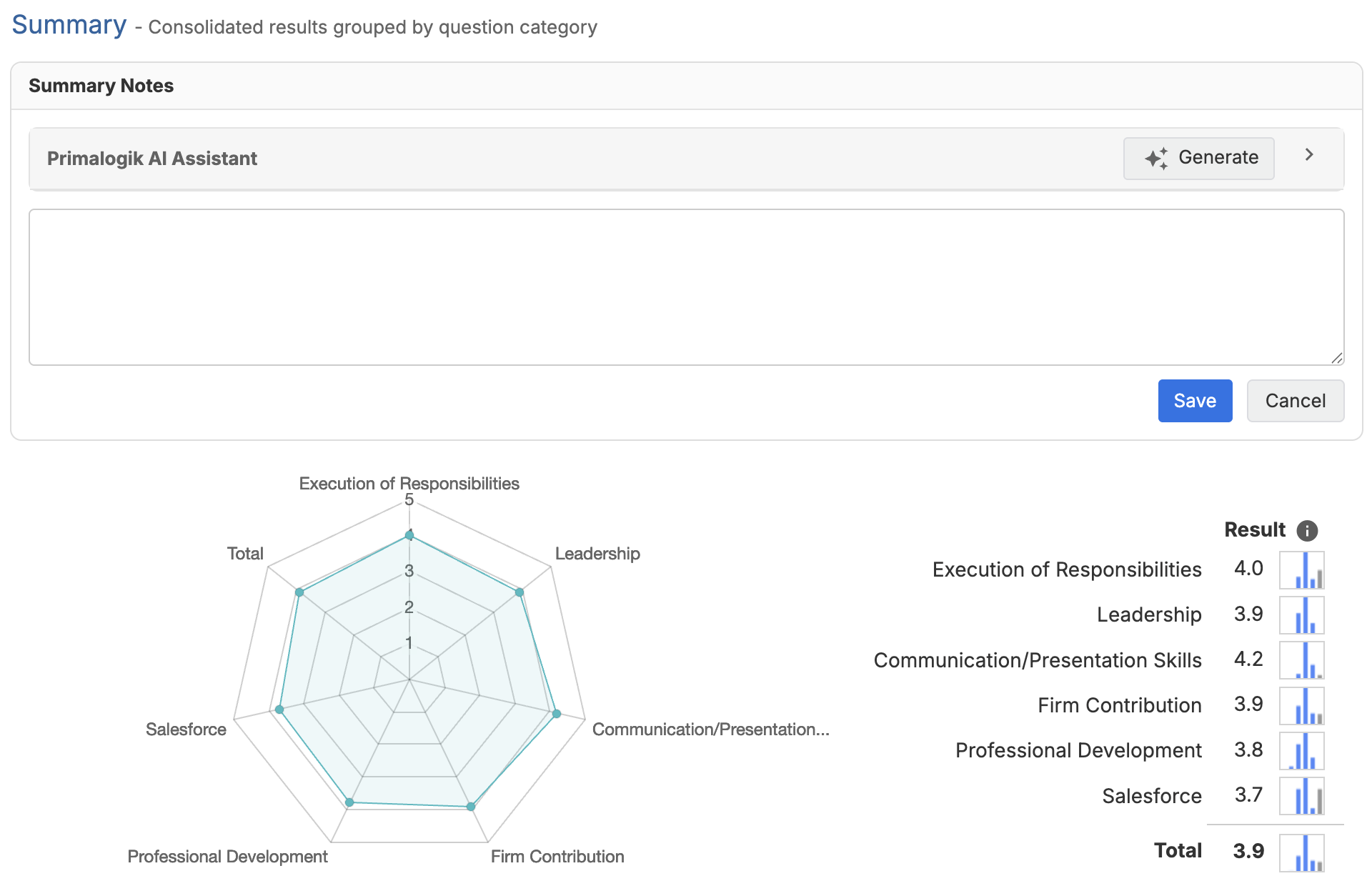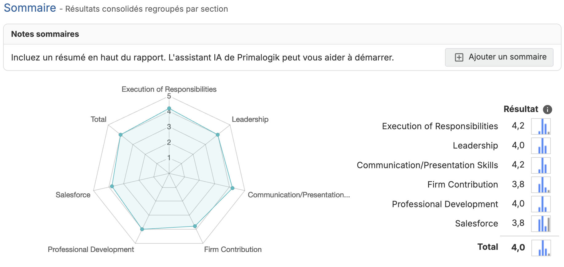 Les rapports d’évaluation dans Primalogik — incluant le feedback à 360°, les évaluations de performance, les suivis (check-ins) et les sondages d’opinion — peuvent contenir une section Notes sommaires située près du haut du rapport.